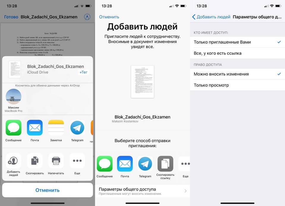 - Выберите уровень доступа (просмотр, комментирование, редактирование)